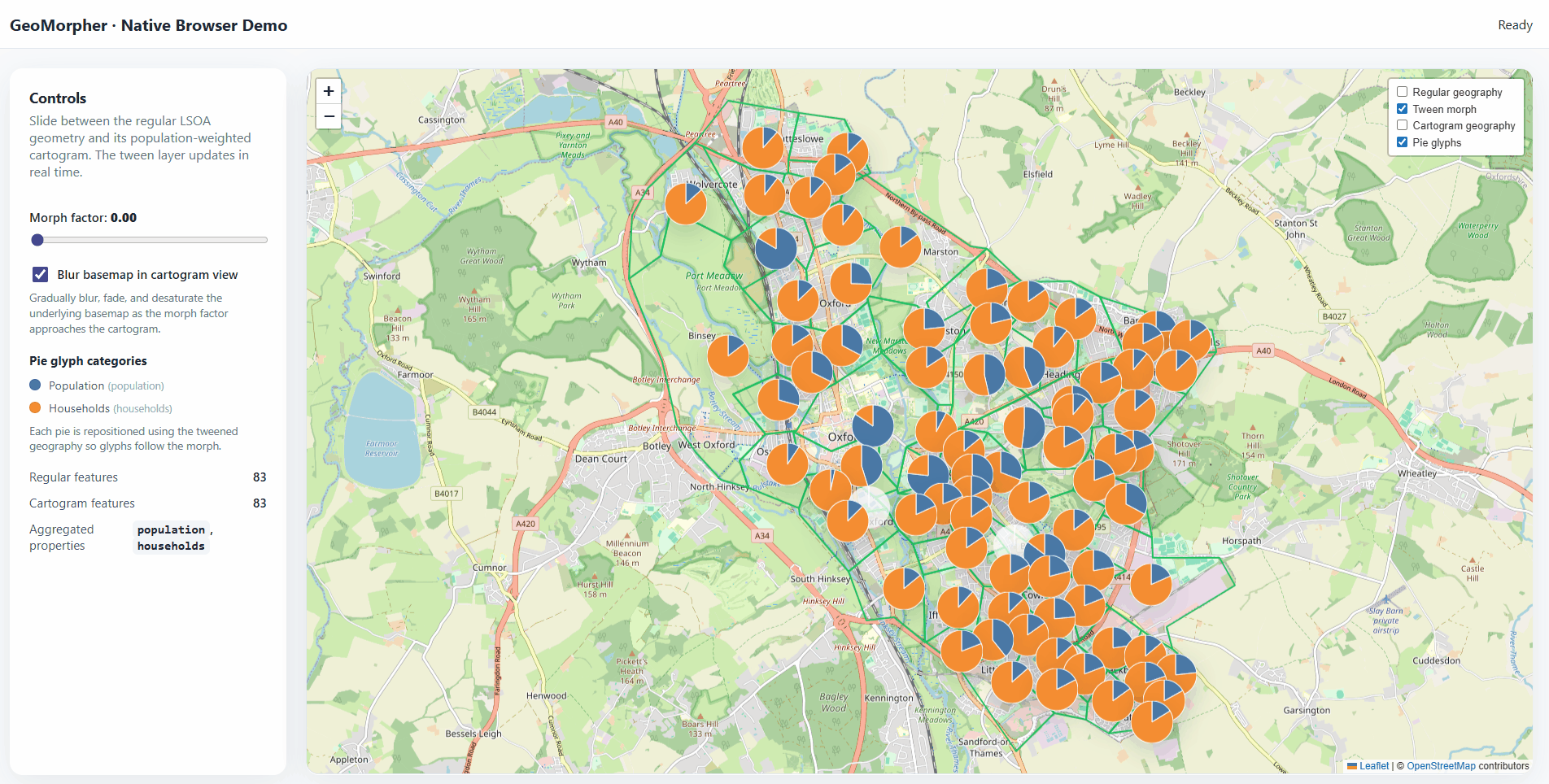 GeoJSON morphing utilities for animating between regular geography and cartograms, packaged as a native JavaScript library with a MapLibre-first adapter and Leaflet compatibility helpers.